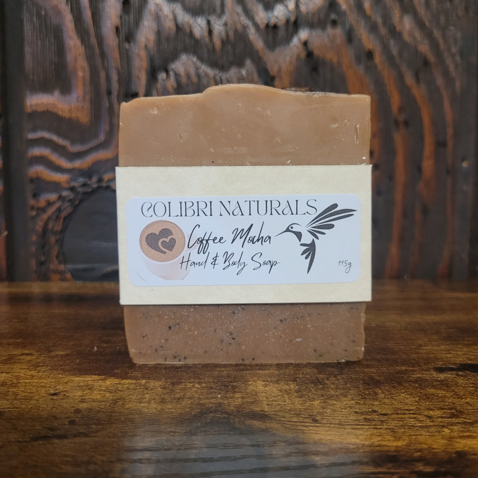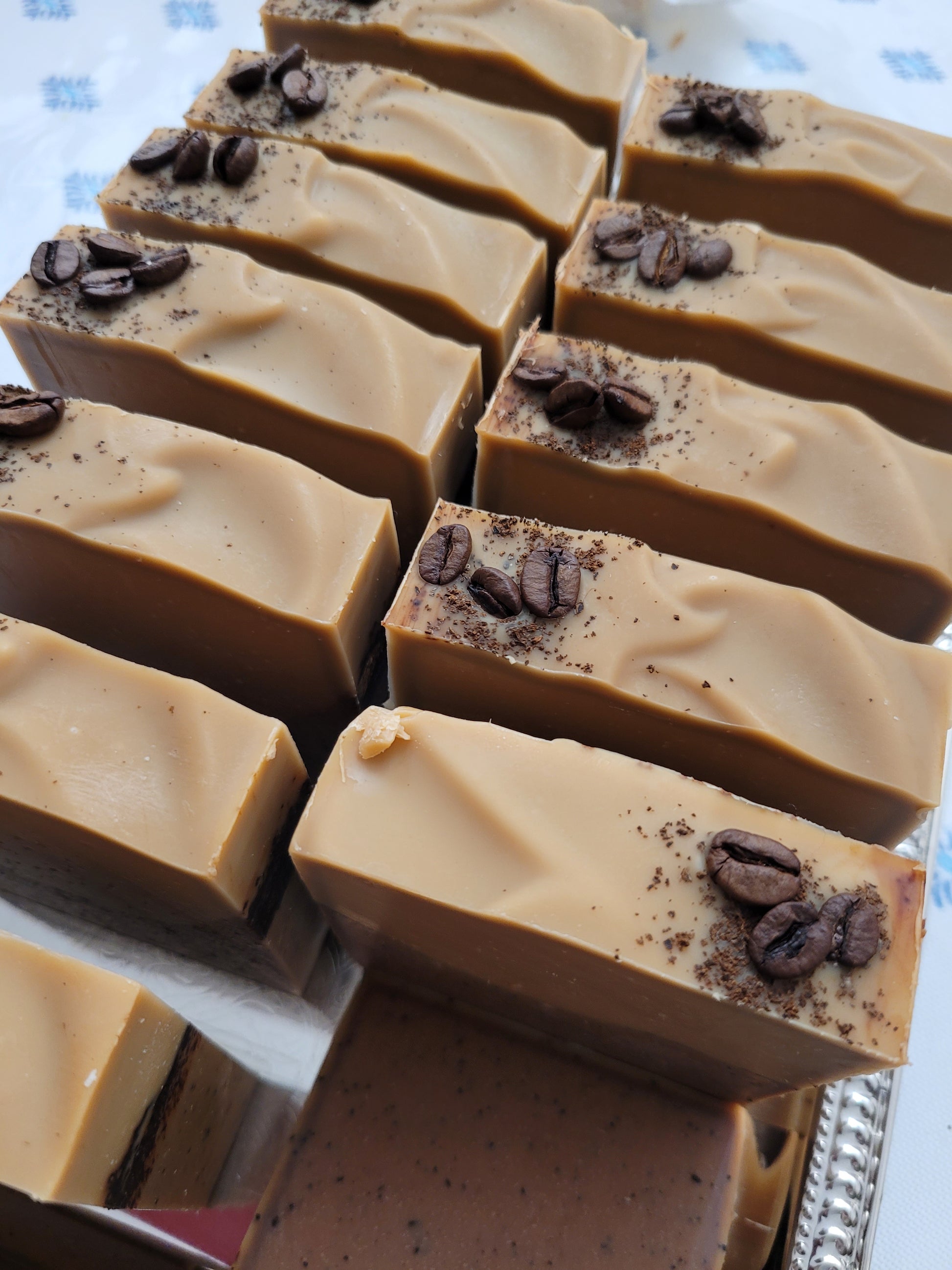 Handcrafted cold-process soap, coffee mocha scent with a layer of coffee grounds for gentle exfoliation.